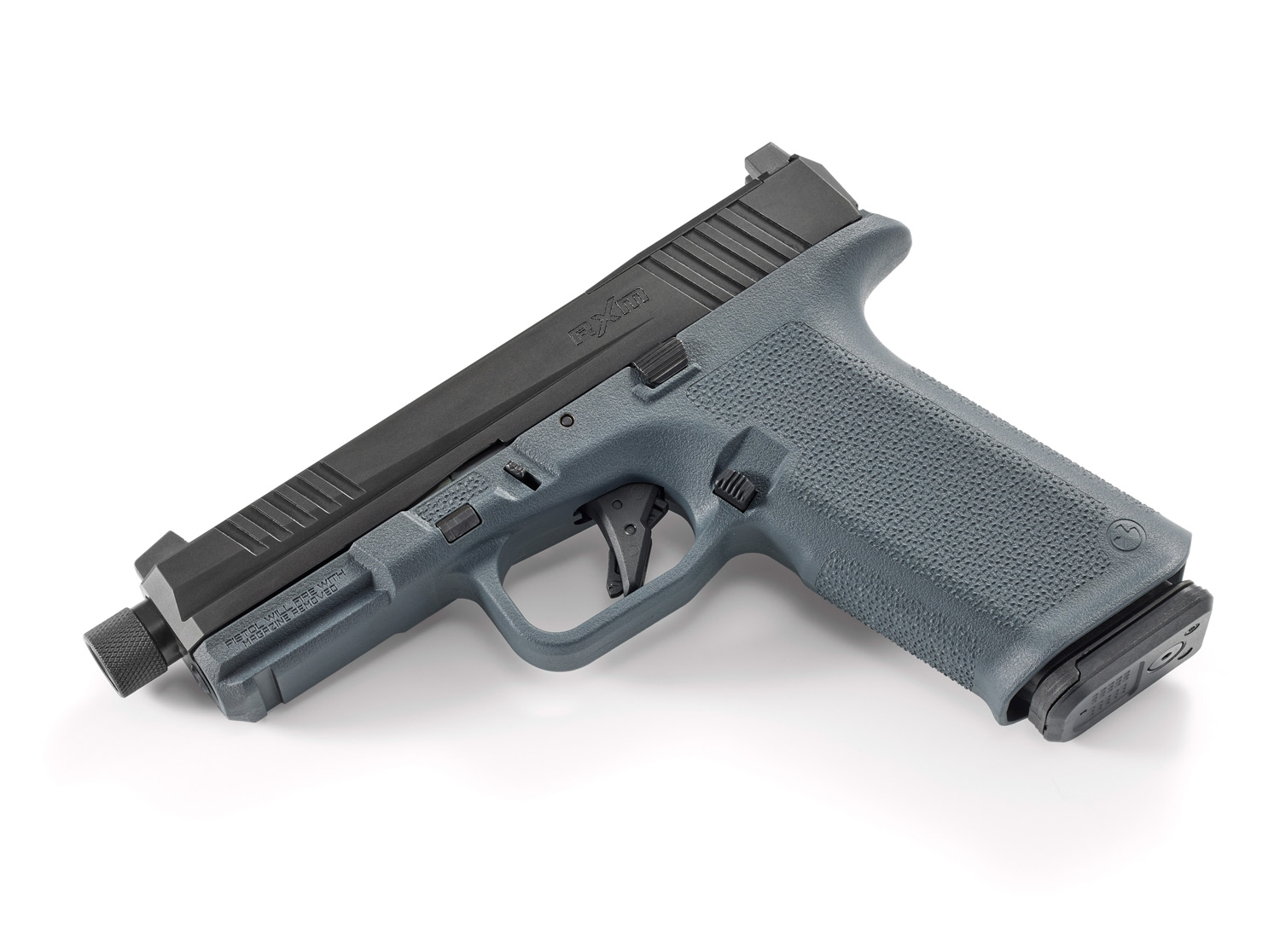 Extended magazine release and raised slide stop.