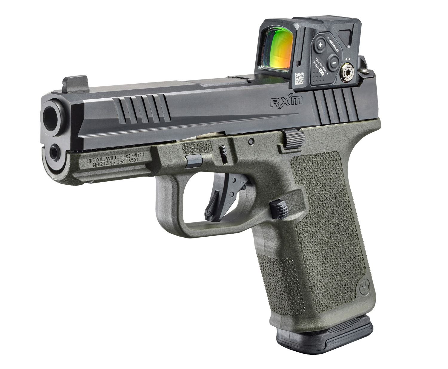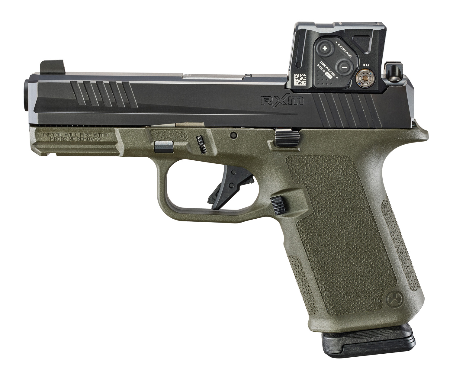 Removable serialized stainless steel Fire Control Insert (FCI) set inside an interchangeable Magpul® Enhanced Handgun Grip (EHG™) for enhanced flexibility and customization.